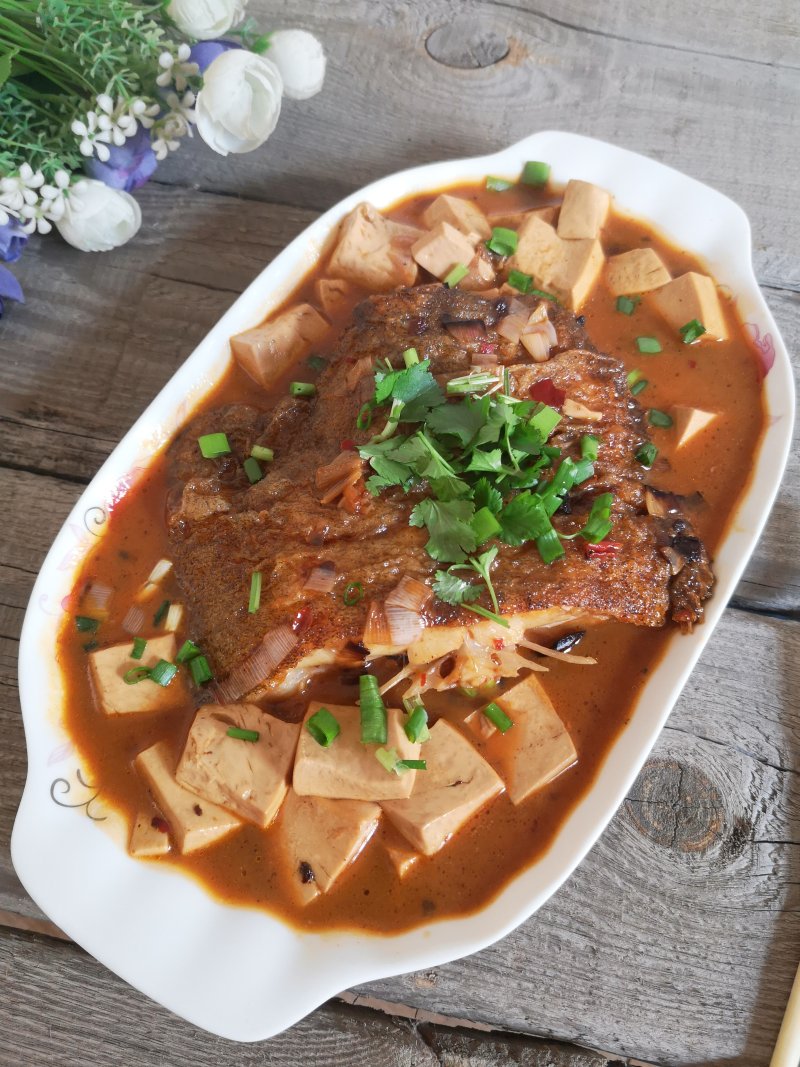 12:装盘后,撒香菜和葱叶点缀。鲜美的豆腐炖鲽鱼,端上桌就吃光啦。