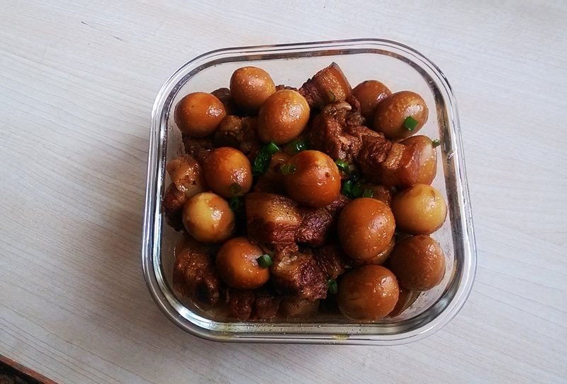 8:肉下锅的时候,电饭锅加两饭碗水,待肉炒好,水也就烧得烫手了。将肉转至电饭锅,鹌鹑蛋也倒进去,慢慢炖,炖至水分基本收干就好了,全过程大约1小时。