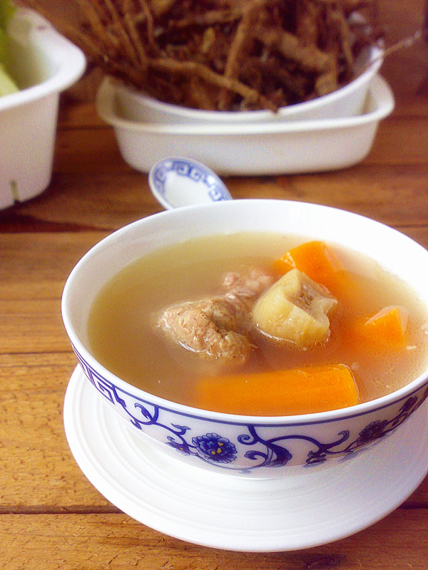 1:备材料,枸杞根清理干净,猪骨焯水,鲫鱼用姜片与油煎过,红萝卜切块