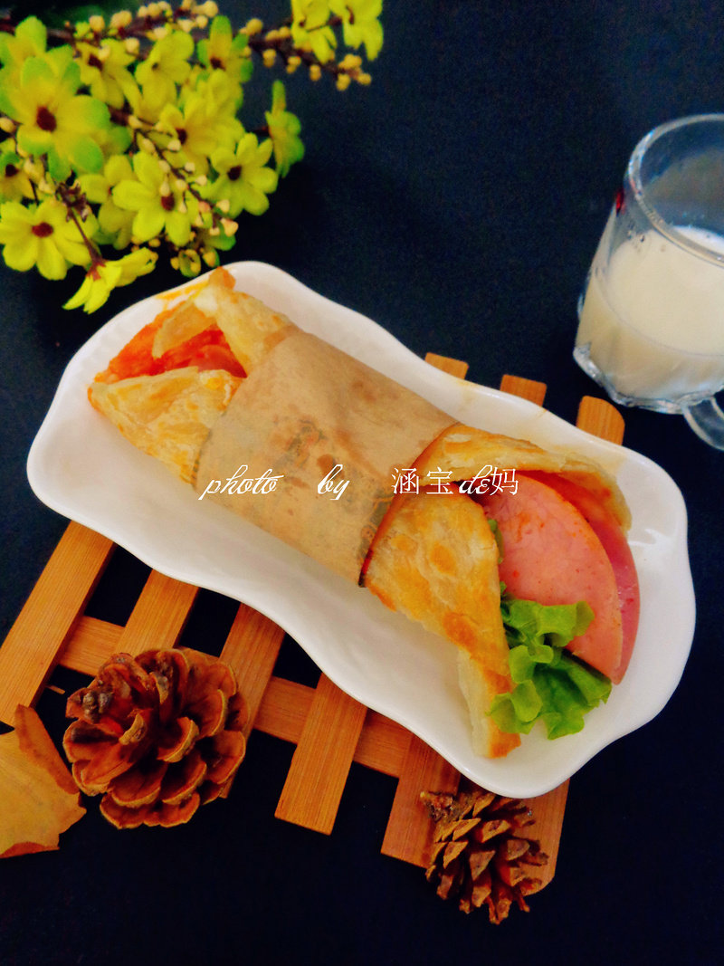 手抓饼皮1张;鸡蛋1个;火腿1条;