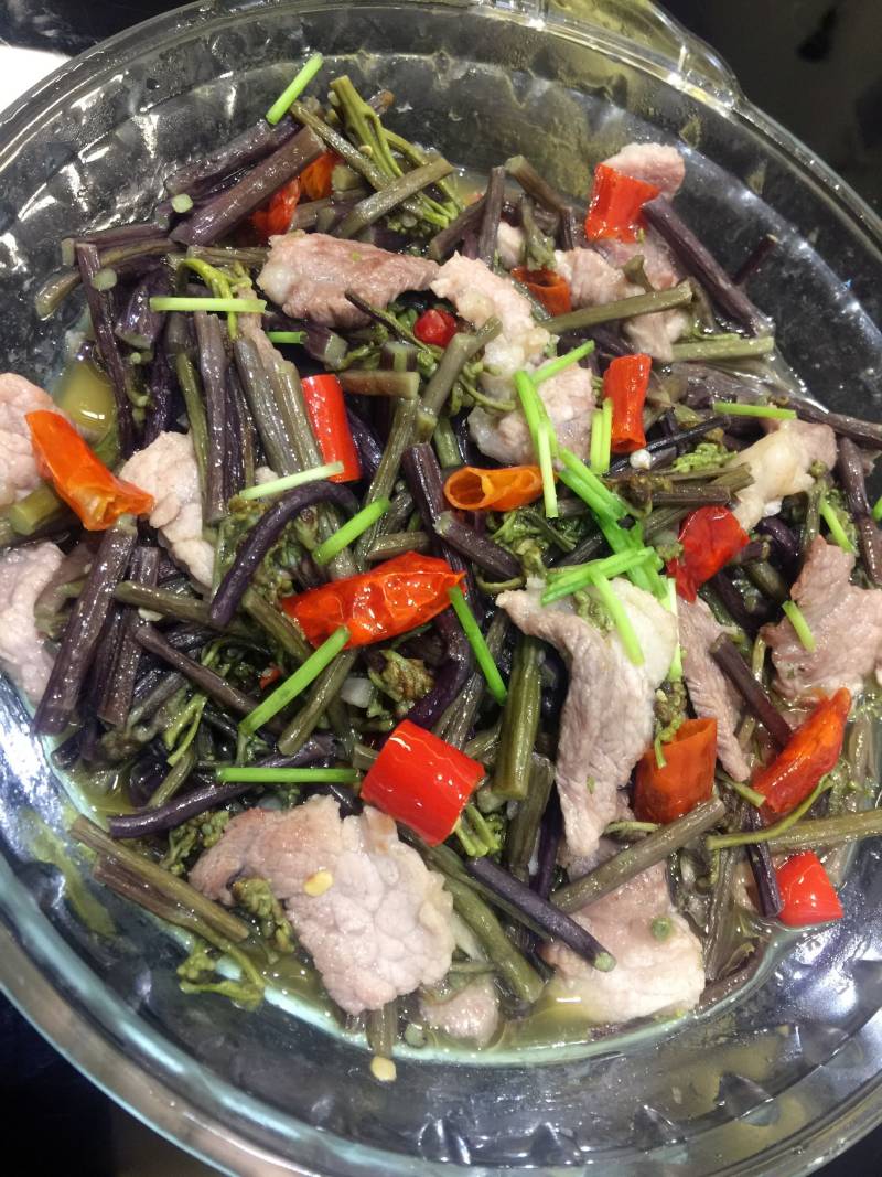 3:把蕨菜且陈小段,(肉切薄片)