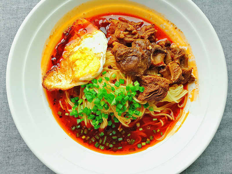 8:炖牛肉的时候就可以把牛肉面的调料准备好。味精鸡精适量,涪陵榨菜颗粒,花椒面、油辣子适量(根据个人口味加)。直接加牛肉原汤,然后煮点蔬菜垫在碗底,面煮好捞起放碗中,舀上烧好的牛肉~和牛肉汤中的红油,撒上葱花或者香菜~每一口都是美好的味道!