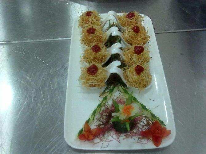 6:炸好的虾球,裹上调好的(沙拉酱和炼乳)5:1比例,再滚上炸好的土豆丝,装盘,