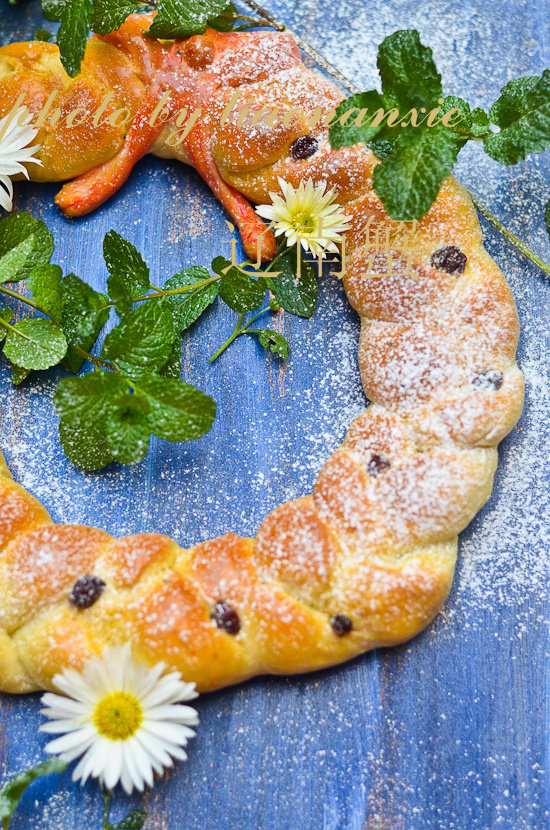 小贴士:面包花环可以做出其它装饰,这是最基础的。面包面团不太容易整形,需要边松弛边整形,急不得。需要借助油纸或者硅胶垫进行整形,方便整形。