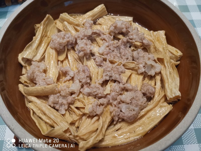 3:肉沫用油盐姜粉等你喜欢的调料先拌匀,再铺到腐竹上面。