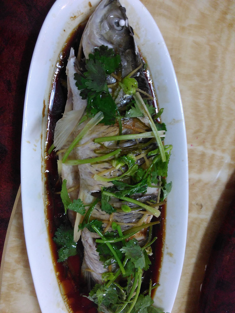 6:把干净的炒菜锅烧红,倒点香油烧热,往蒸好的鱼上一浇就OK了。