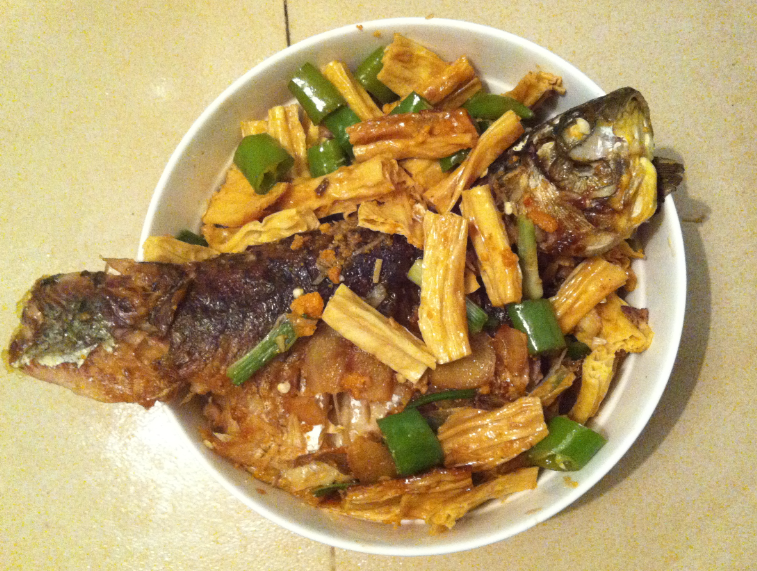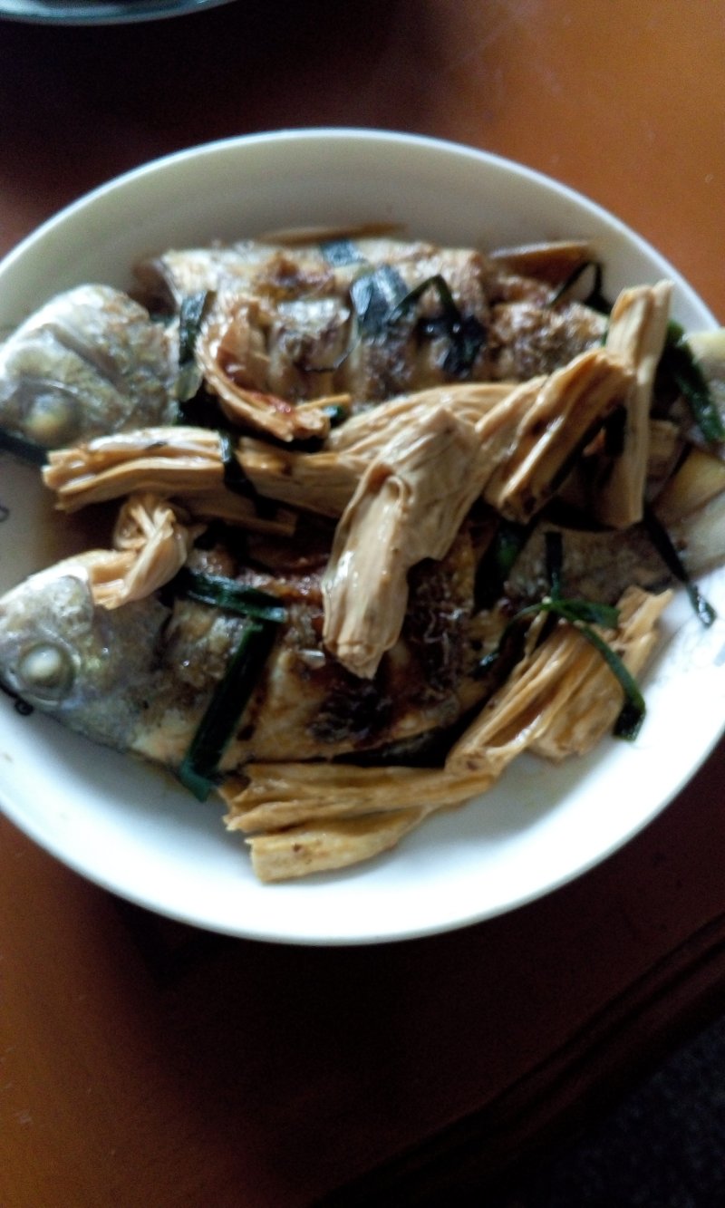 4:所有材料预备好之后,热锅先放腐竹,然后放鱼,然后放湖南椒。稍微将腐竹翻一点盖住鱼,加盖闷5分钟。起锅前加入生抽和盐调味。