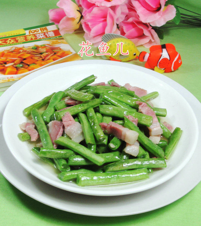 1:食材:熟肉片、梅豆(已摘洗干净)