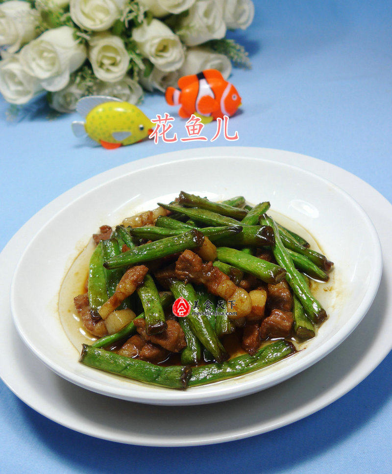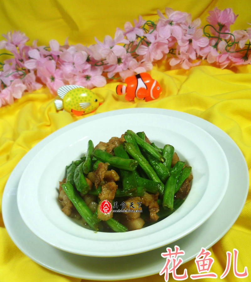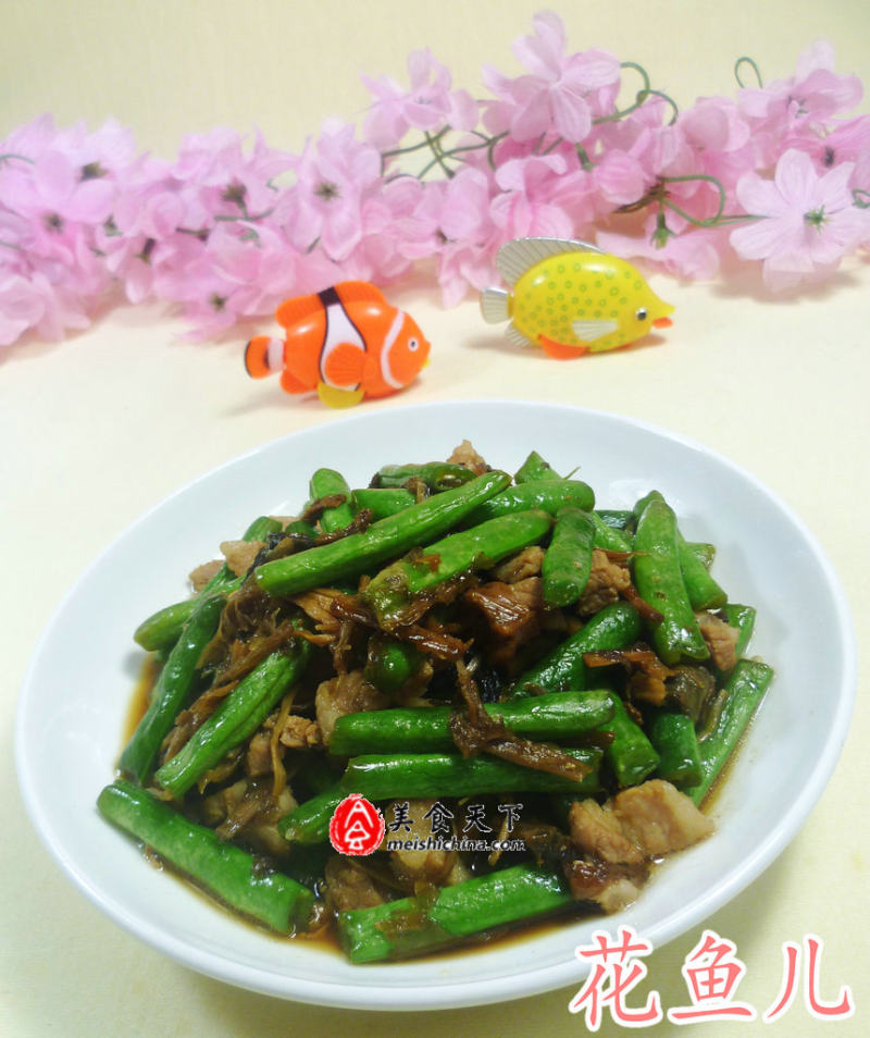 6:然后,合入摘洗好的梅豆翻炒翻炒至熟。