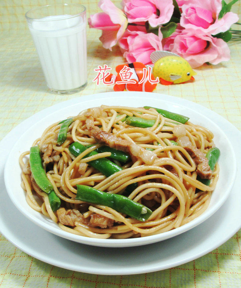 5:接着,合入过凉好的面条和焯好的梅豆翻炒翻炒。