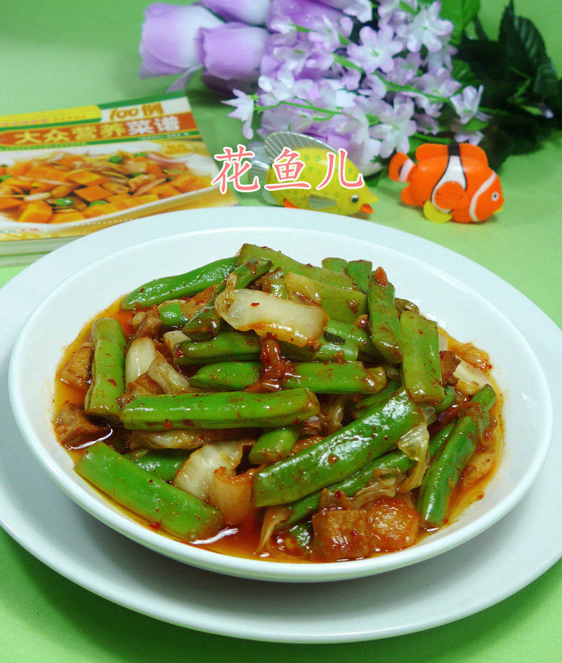 1:食材:熟五花肉(已切开)、梅豆(已摘洗)、泡菜