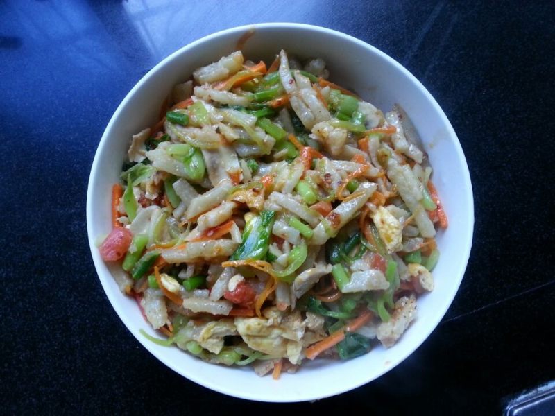 8:1.炒锅放油把小碗的西红柿蒜小红椒炒红2.炒锅放油分开炒4-7步里的各种丝3.炒锅放油,炒蒸好的土豆条,以及放入各种丝4.铛铛铛铛,大功告成!