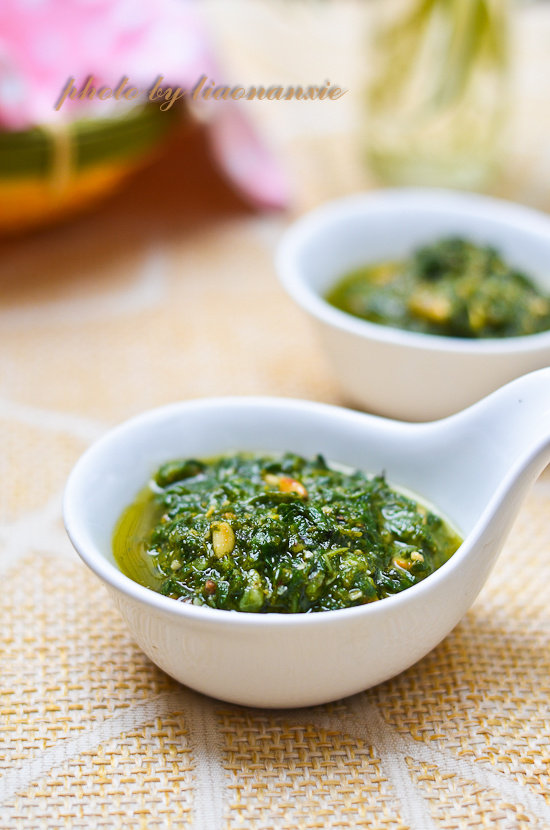 罗勒叶子尽可能淋去水份。配方中的数量不是一定的,可以自行调整味道稍有区别。每次取完青酱都要用油封面。