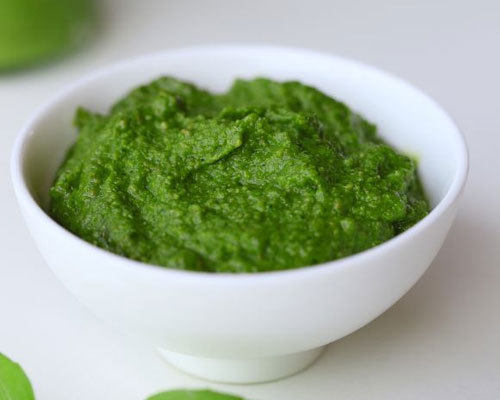2:用石臼将罗勒叶捣成泥,可以加上一点盐,有助于快速成酱。