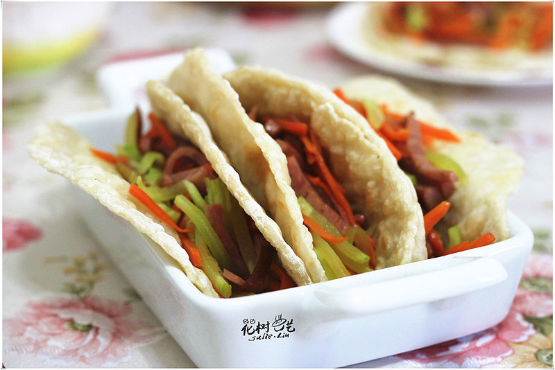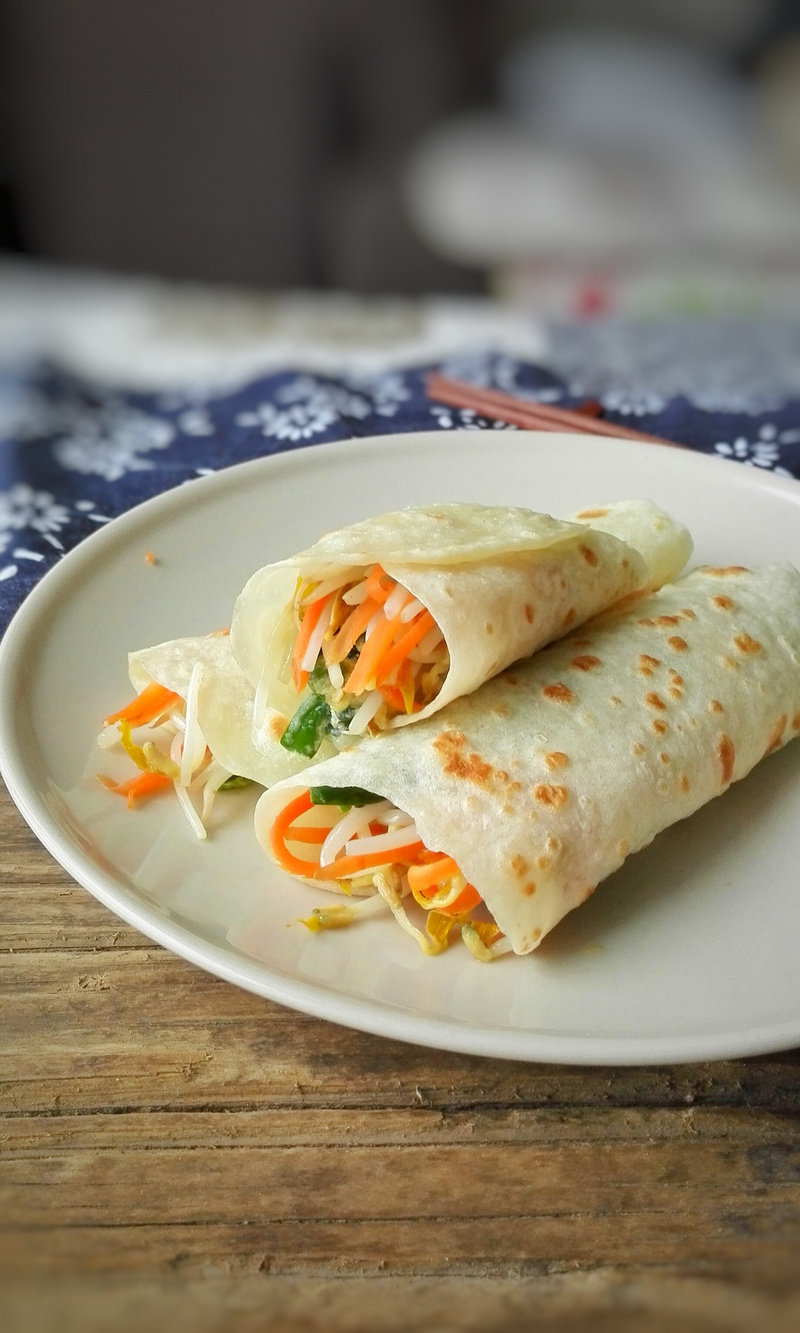 9:用饼子将炒菜卷起食用即可