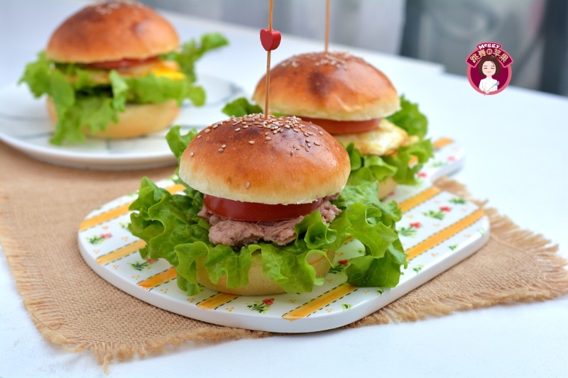 12:汉堡内容可以随意,我今天做的是煎蛋、罐装金枪鱼,再来点生菜叶、西红柿片,双漂亮又灵。