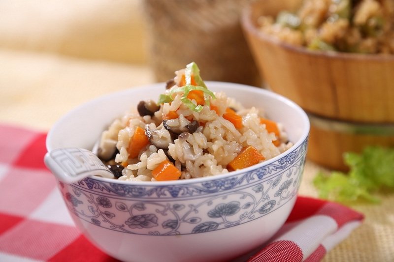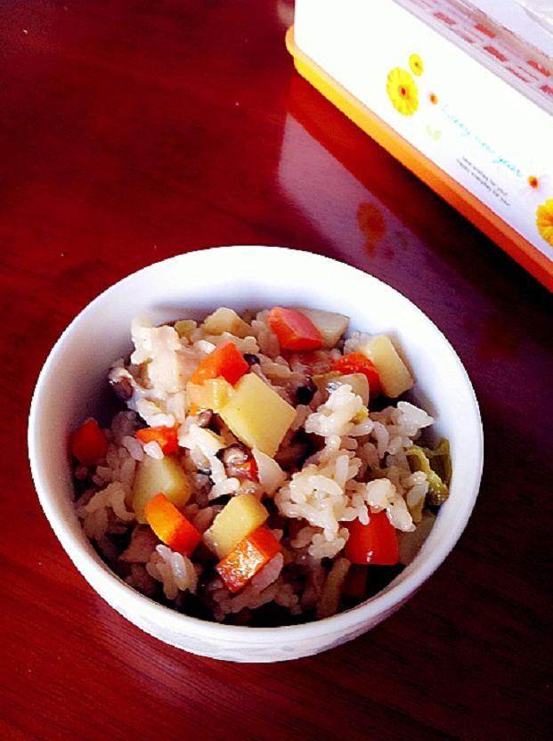10:开启电饭煲煮饭功能,40分钟后香喷喷的胡萝卜、香菇焖米饭做好了