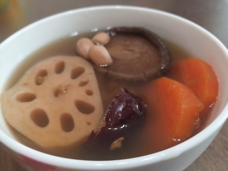 1:胡萝卜.莲藕片和香菇各三,花生米和姜适量,红枣三个去核。