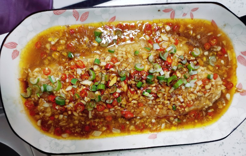 7:蒸好的鱼放入香葱.蒸鱼豉油,在放少量油加热后倒至香葱上即可