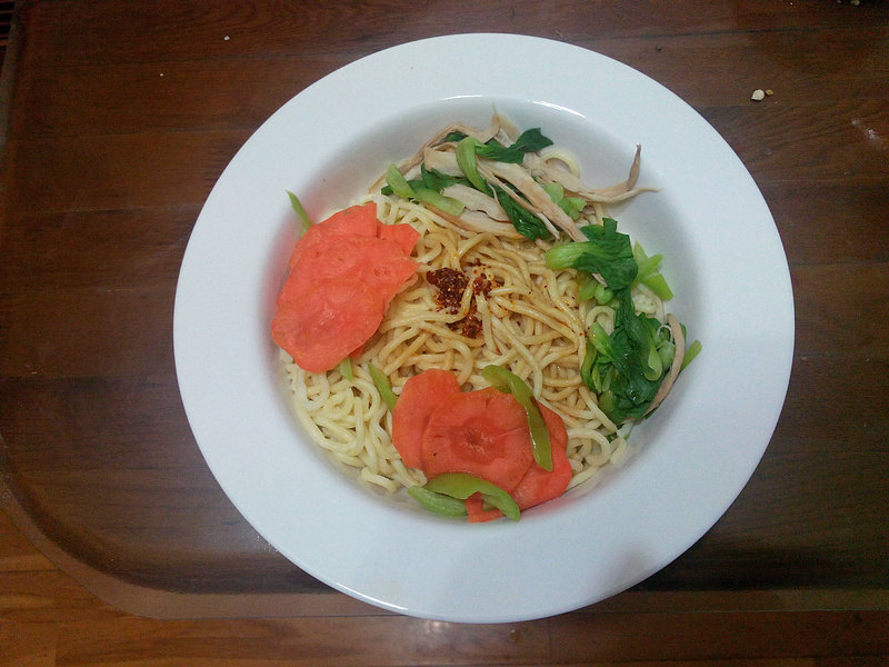 22:捞出面条,加入焯好的胡萝卜、尖椒、杏鲍菇、油菜,倒入酱油、陈醋、辣椒油,搅拌,大功告成。