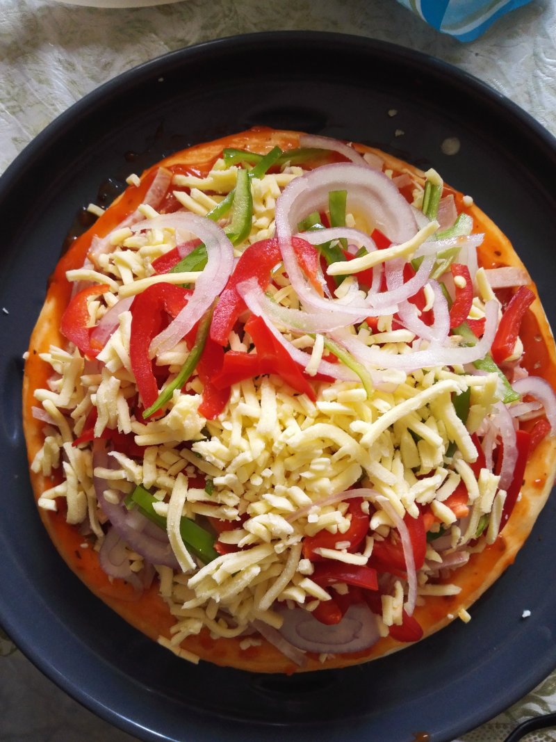 7:之前切好的洋葱,灯笼椒,青椒,铺在奶酪上,在蔬菜上面再铺一层奶酪,依次铺完。堆成一个小山包的样子