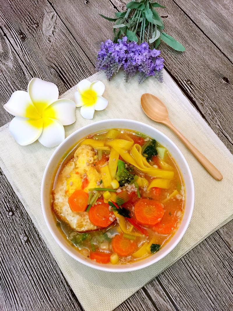 鸡蛋适量;猪肉碎适量;玉米粒适量;芹菜适量;番茄适量;南瓜短面适量;西兰花适量;香菜适量;胡萝卜适量;