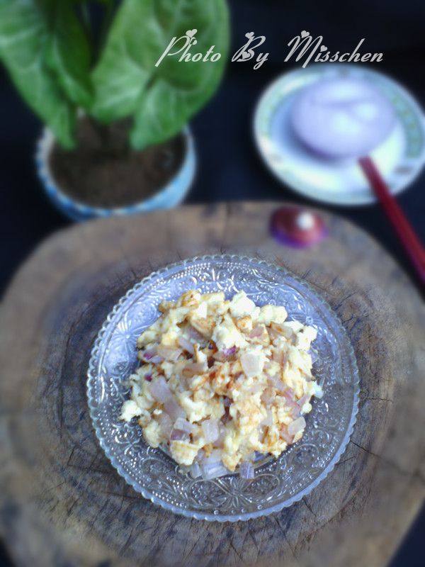 1:洋葱去膜洗净切小丁,鸡蛋磕入碗中加少许盐、醋打散