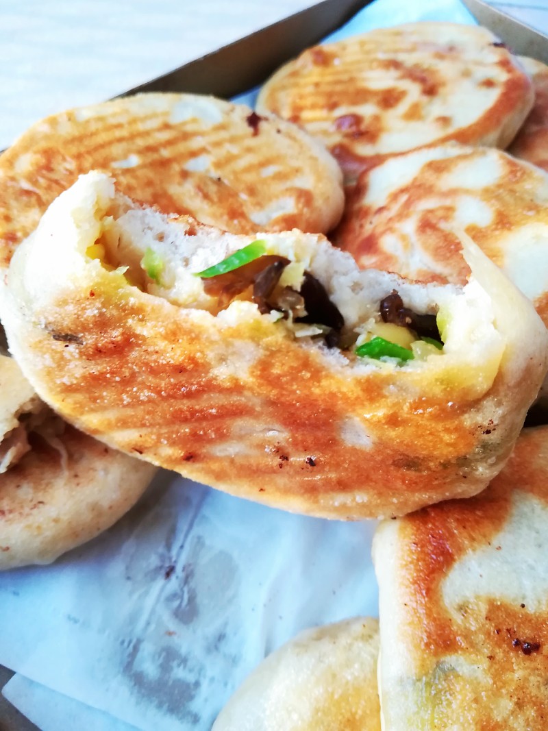 13:舀一勺馅儿放到面饼上,包起来后按扁