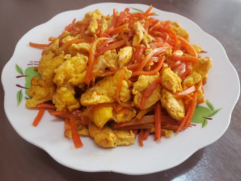 5:锅烧热放少许油,倒入蛋液,翻炒一下,用铲子捣块,再倒入红萝卜加盐和生抽调味,翻炒几下即可。