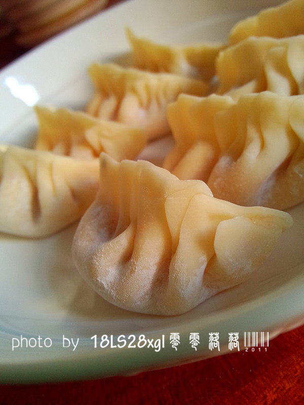 4:取一片饺子皮,包入胡萝卜肉馅;
