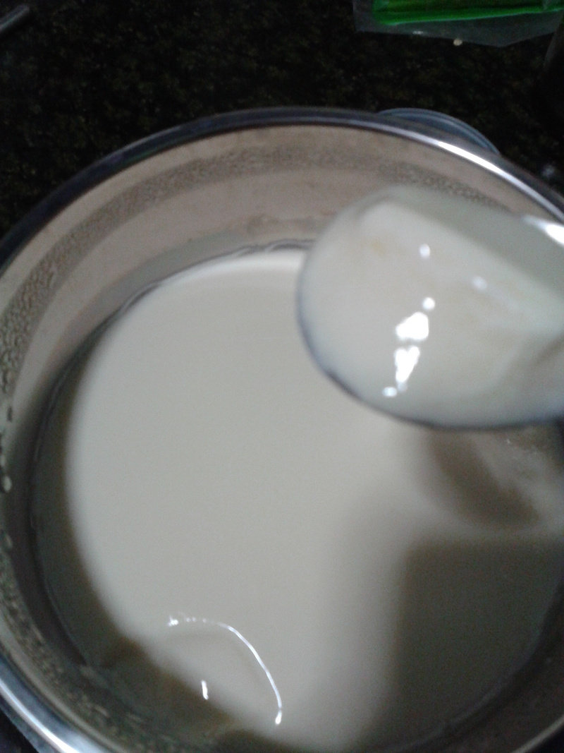 2:取一盒奶倒一半到盆子里放入适量的糖加热,使糖分溶解于奶中,放一旁备用。
