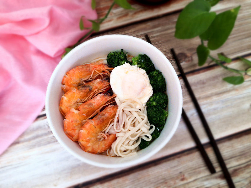 鲜虾4只;金龙鱼活性发酵空心挂面80克;鸡蛋1个;西兰花少许;