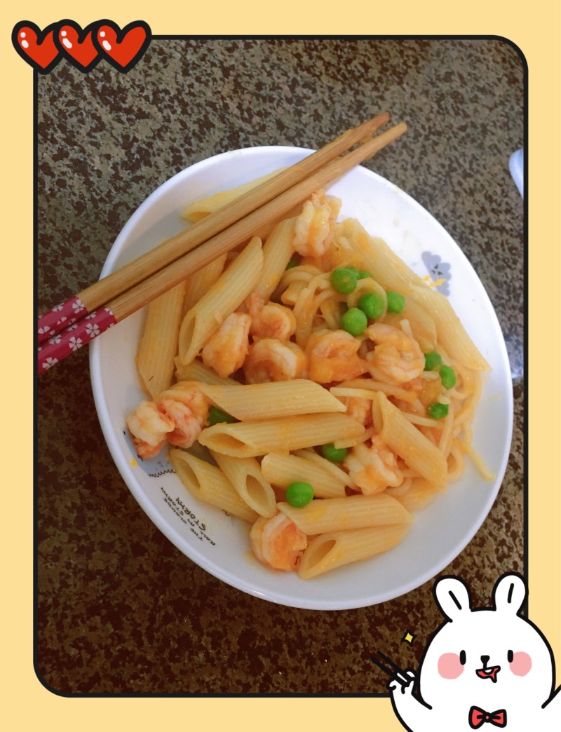 4:再加入过水焯熟的意面和豌豆还有一勺番茄酱,继续焖煮,煮到南瓜变成泥后加入适量鸡精,翻炒一小会就可以关火。