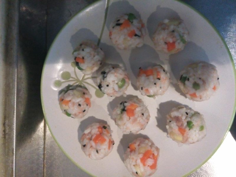 4:揉成大小适中的球形饭团,金枪鱼有粘合性,如果是用的火腿丁,不易成团的话可以用保鲜膜包裹挤压成团即可。