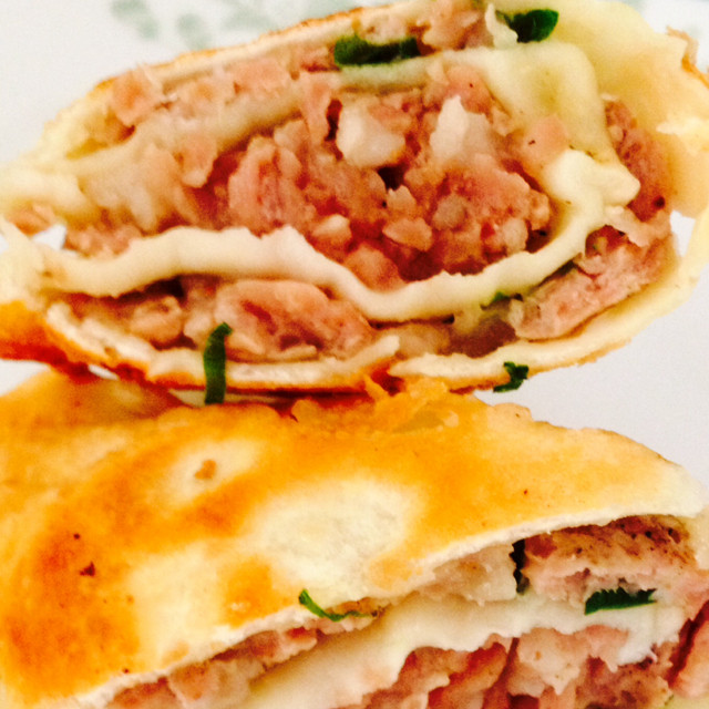 9:成品切块即可食用(小提醒:煎饼必须加入水来煎,否则面饼肉馅不熟,面饼焖煮到差不多干水时,打开盖留意面饼,来回翻面煎成金黄色就可以了)