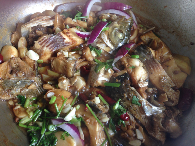 2:把辣椒,花椒,姜丝放入后加适量糖,生抽,陈醋。把鱼块放入,中火烧20分左右收汁。最后放葱花香菜