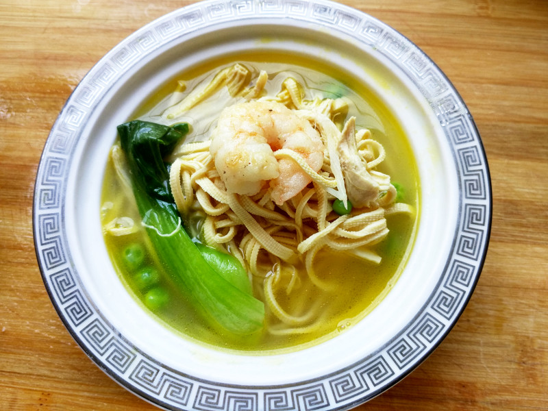 4:加入虾仁,大火煮五分钟,加盐,加鸡精,加一把青豌豆(太时令了,家里有随手就加了),加入青菜,继续煮两分钟!