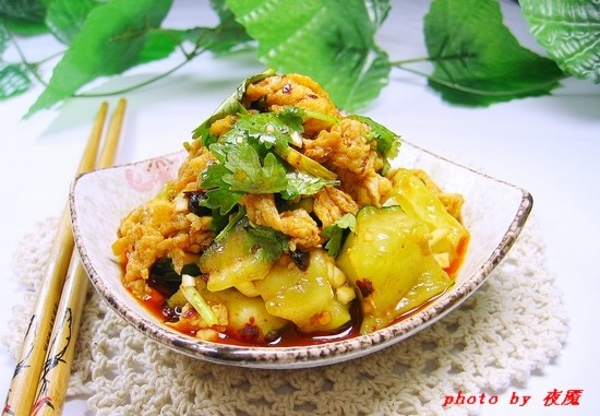 Ps:几个小窍门:1、蛋液中入醋和水能让鸡蛋更加嫩,调入料酒可以去腥,但不可多加。2、这是一道凉拌菜,所以要将鸡蛋晾凉,再和生的黄瓜拌在一起,这样口感才好。3、黄瓜用刀拍开,再用手掰成小块,横断面不规则更容易入味。4、各种调料的比例可以根据自己的口味来调整,香辣酱也可以根据自己的口味来放。