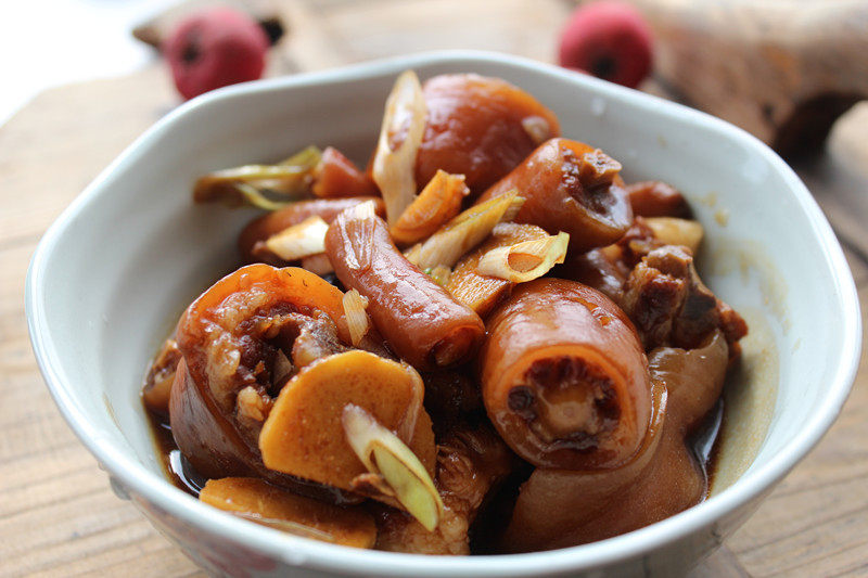 6:加适量味极鲜酱油,加水刚没住猪尾,开火煮,上汽后中火10分钟,出气后倒入砂锅收汁,起锅前加青蒜