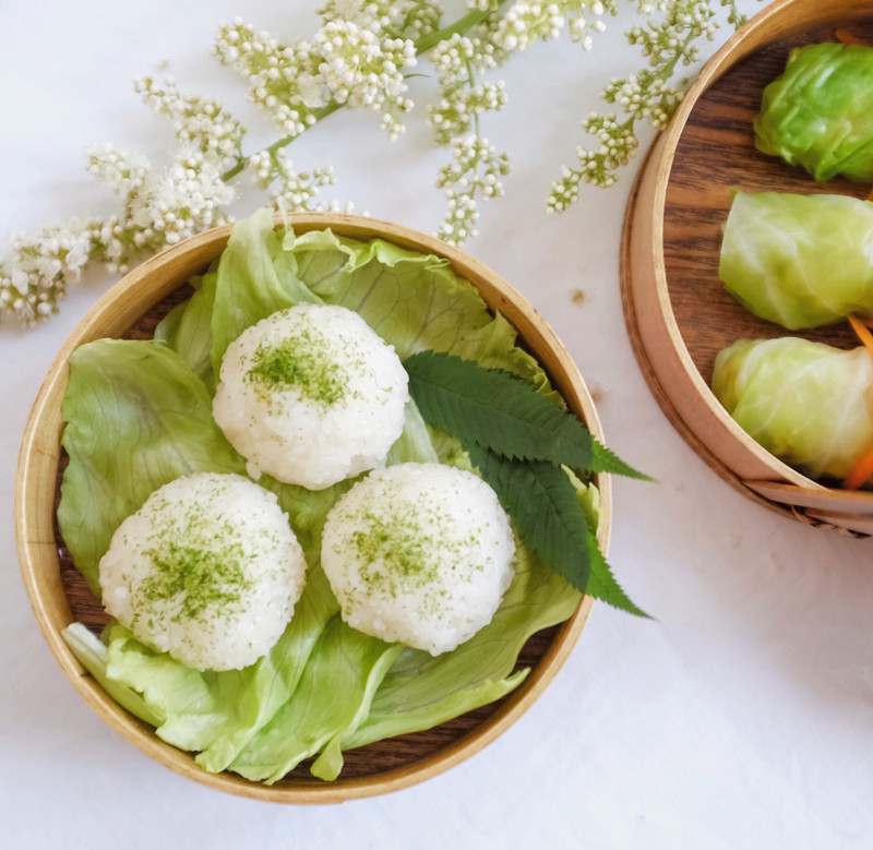3:备好卷心菜叶,铺在饭团下方。