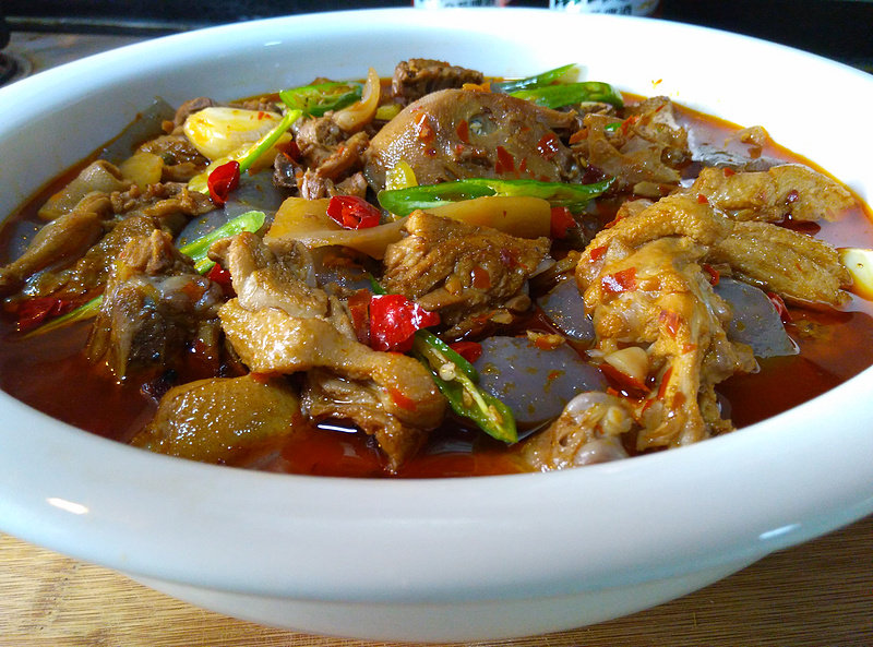 4:倒入青椒段烧10分钟,请辣味入到鸭肉里。