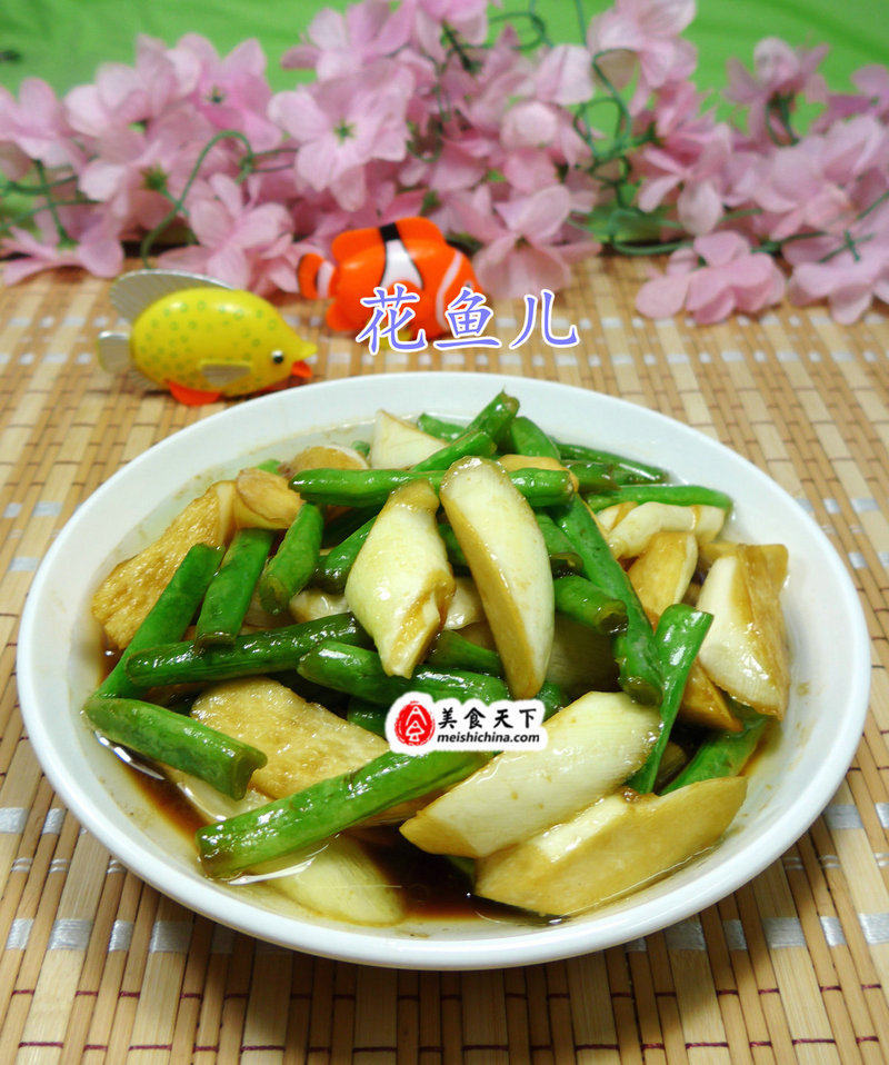 4:烧锅倒油烧热,下入切好的茭白和摘洗好的梅豆翻炒翻炒。