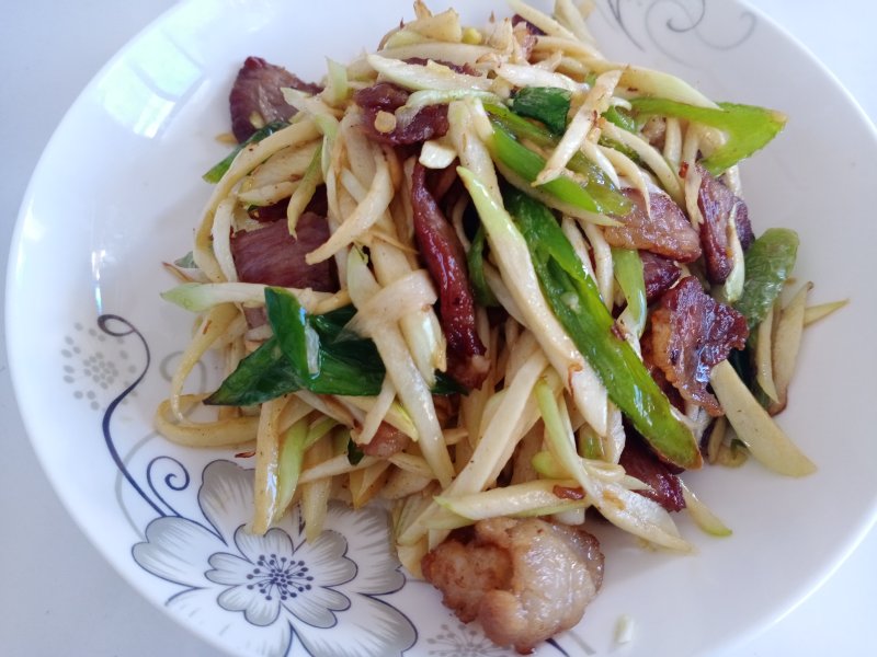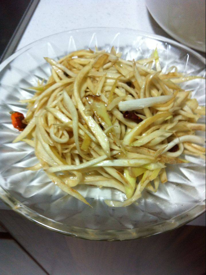 3:清洗干净,用刀先切薄片,再切成细丝。