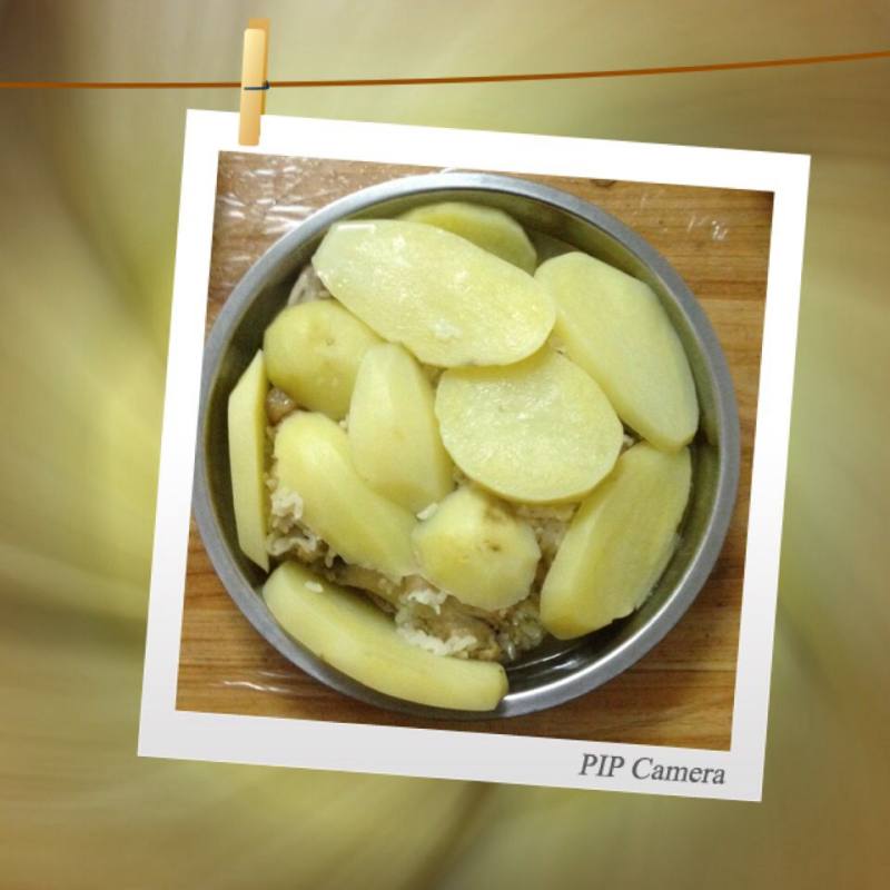 3:先在盘子里均匀铺上少量的花生油,然后铺上一层土豆,把糯米和鸡翅搅拌一起,放到土豆上面