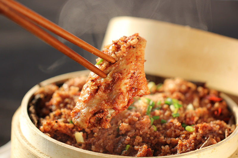 1.这次自制蒸肉米粉我用的是糯米,用普通米也一样,糯米的粘性大些,看各人口感;加入大料一起煸炒香,糯米表面微微发黄就可以了,放入搅拌器中打碎成细小的颗粒,不要太碎,让米粉吃到口里有点颗粒状的感觉;2.鸡翅表面上划上几刀方便入味;先加入盐等调味料腌制一会后,再加入米粉和腐乳汁等,腌制时间稍微长些更好;土豆分别腌制,时间可以稍微比鸡翅短些;3.蒸肉时先在竹蒸笼下垫一张荷叶,如果是干荷叶先用水泡上;最下面铺层土豆,再将鸡翅码放在上面;一般蒸菜是都是素菜垫底,荤菜码放在上面;为了避免水蒸汽进去,可以最上面盖上张荷叶,这样荷叶的清香更加渗透入菜品中。