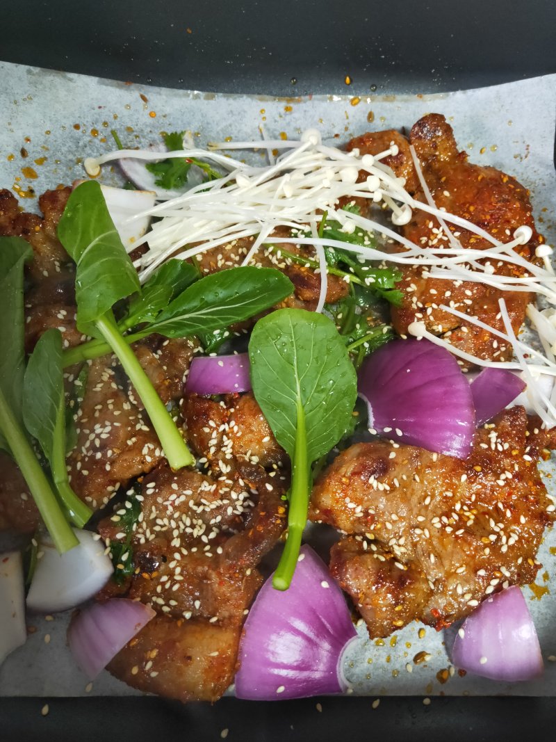 7:把肉切成小块,这时菜已经蔫了,肉再烤一会就熟了。