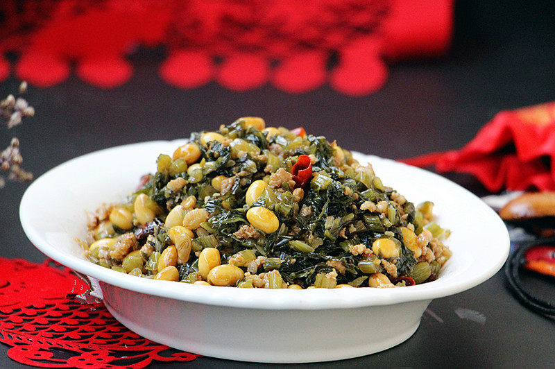 雪里蕻300克;肉末100克;泡发好的黄豆100克;