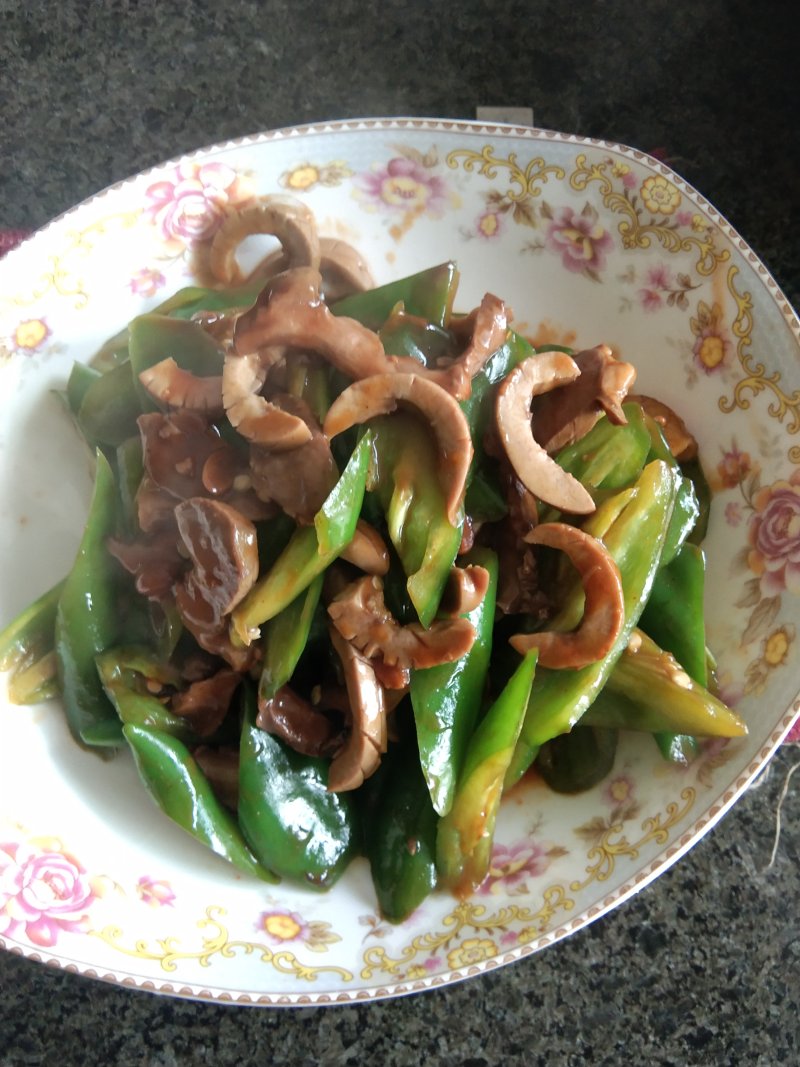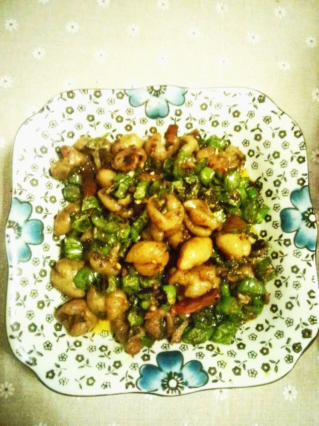8:肥肠变金黄时,倒入尖椒。加盐、鸡精、酱油