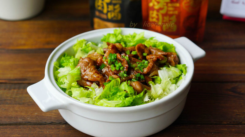 8:装入之前备好的盘子里,把肉片放在生菜碎上面,直接上就可以了。这是一道又简单又好吃的家常菜,脆脆的生菜碎配着香滑的肉片,每一口都是满足。