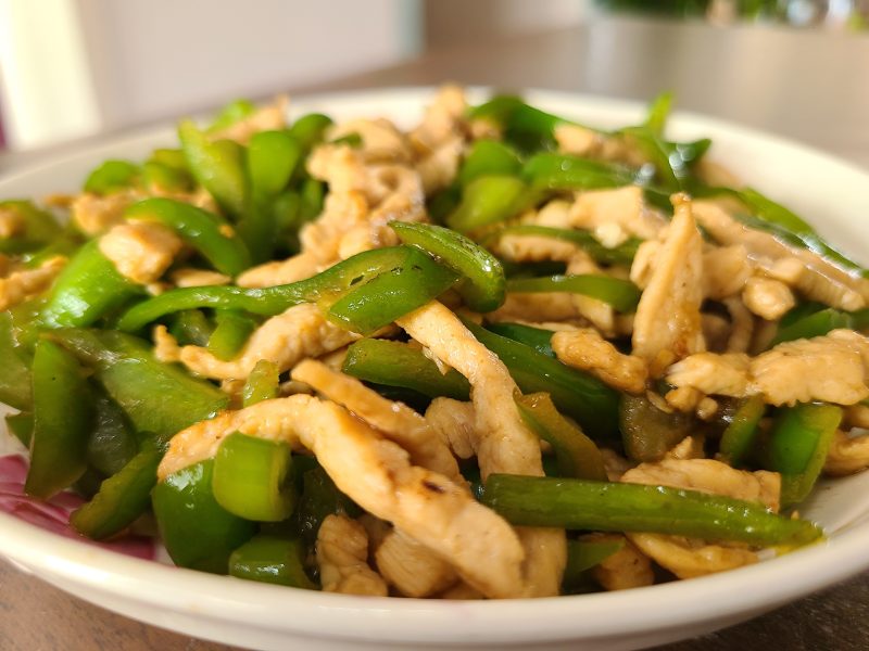 5:锅烧热放少许油,倒入鸡胸肉丝,翻炒几下,再倒入青椒炒香,加少许盐和生抽调味,翻炒片刻即可。